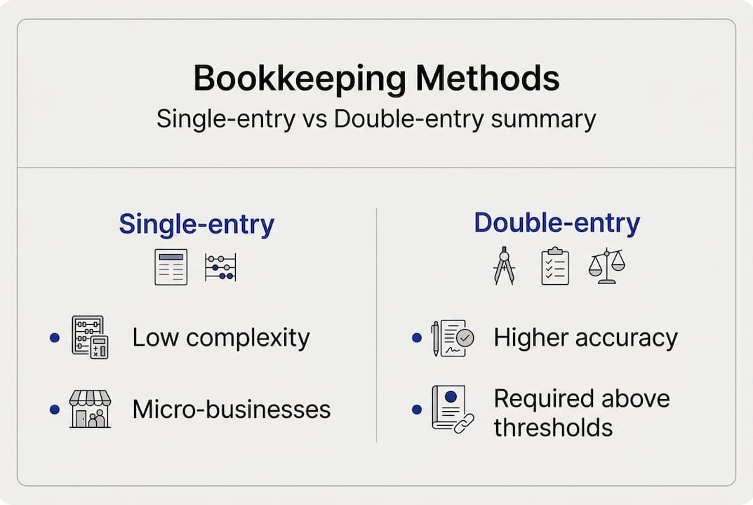 | Choose the right method | Double-entry bookkeeping is mandatory if your business exceeds key thresholds, while single-entry may suffice for smaller operations. |